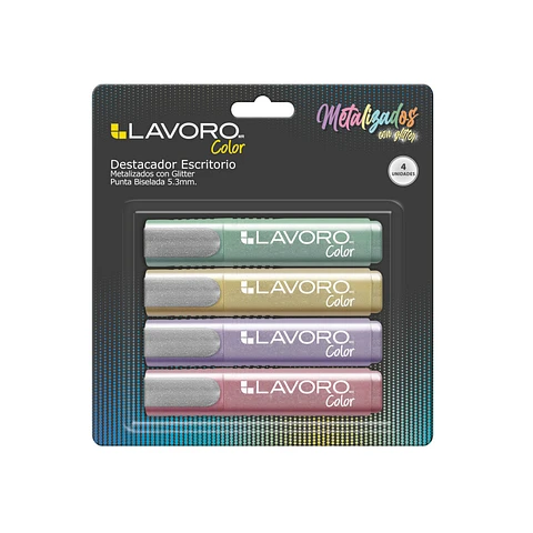 Resalta tus ideas con un toque brillante gracias al Set de Destacadores Lavoro Metalizados con Glitter. Incluye 4 colores únicos que combinan la intensidad de los tonos metálicos con el brillo del glitter, perfectos para...