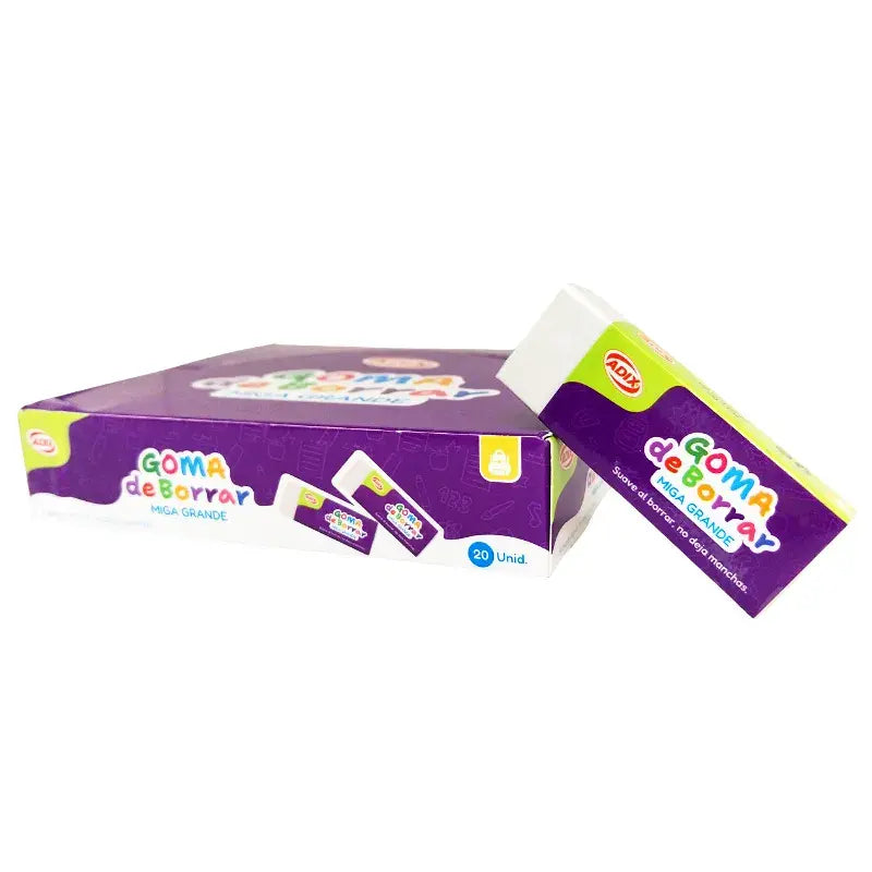 Logra un borrado limpio y sin esfuerzo con la Goma de Borrar Miga Grande Adix. Suave y efectiva, elimina trazos de lápiz con precisión sin dañar el papel, dejando tus trabajos ordenados y prolijos. Gracias...
